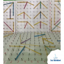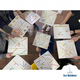 Já a segunda atividade foi utilizando o "GeoPlano", material concreto e manipulável, que possibilita que os alunos reproduzam, utilizando um tabuleiro com elásticos coloridos, as representações de ângulos, seus elementos e suas classificações.